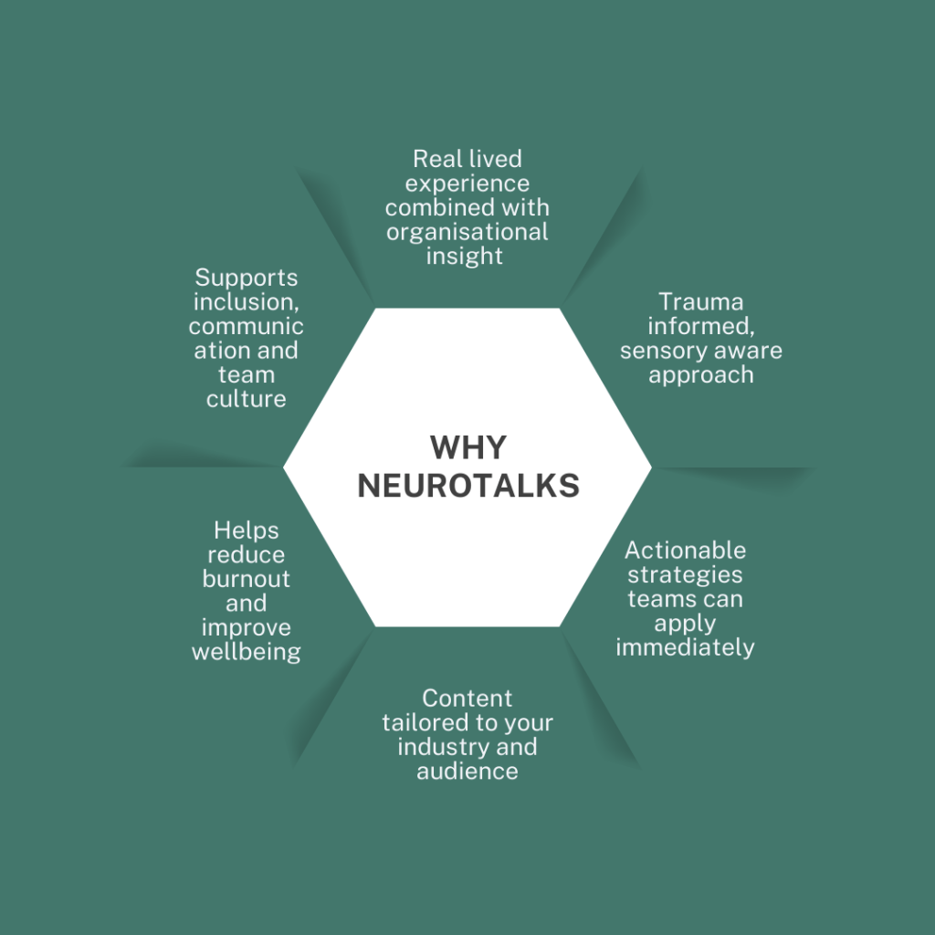 Practical, lived experience training that helps teams understand neurodivergence, reduce overwhelm and build inclusive, high performance environments.